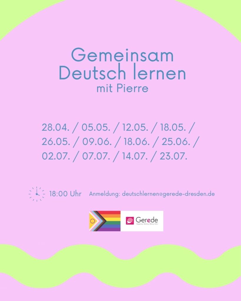 El grupo se reúne para aprender alemán, fuera de las clases de alemán y en un entorno protegido y respetuoso con la comunidad LGBTQ*, con el fin de practicar, profundizar conocimientos e intercambiar ideas. No hay requisitos lingüísticos. Los temas pueden incluir conversaciones cotidianas, el alfabeto y cierto vocabulario, así como gramática. Para inscribirse y obtener más información, puede ponerse en contacto con nosotros aquí: deutschlernen@gerede-dresden.de