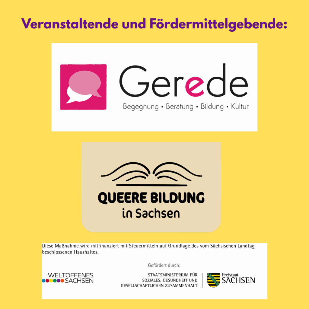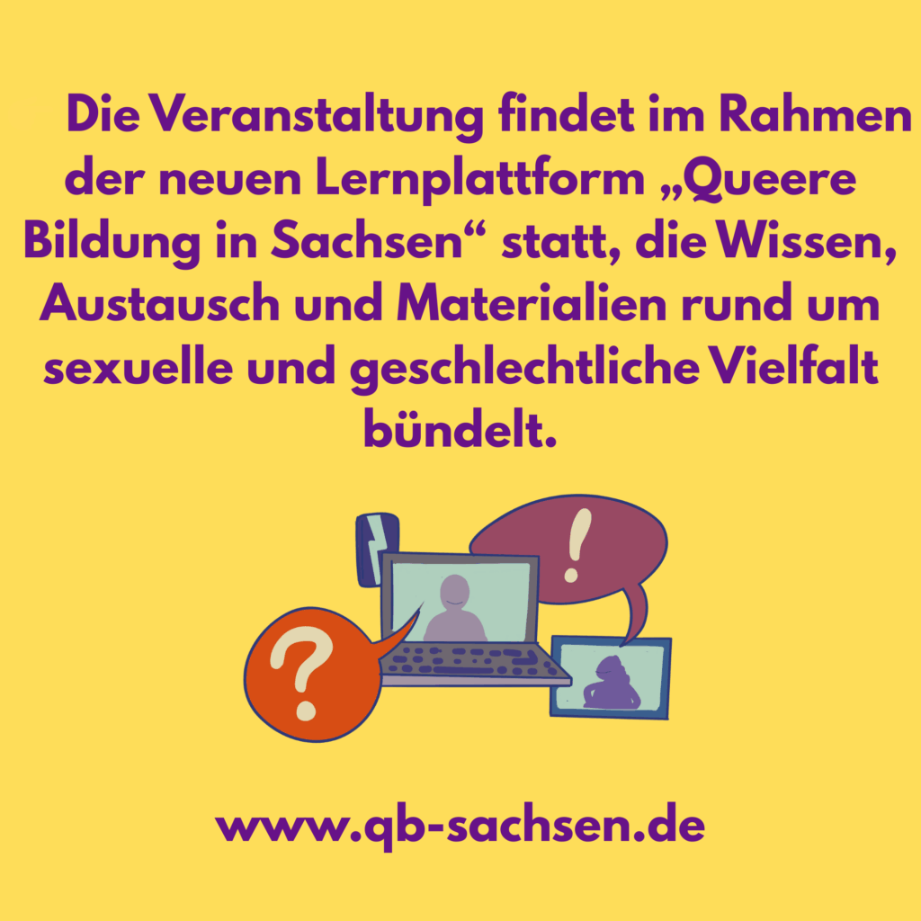 👉 Die Veranstaltung findet im Rahmen der neuen Lernplattform „Queere Bildung in Sachsen“ statt, die Wissen, Austausch und Materialien rund um sexuelle und geschlechtliche Vielfalt bündelt.